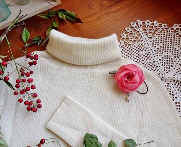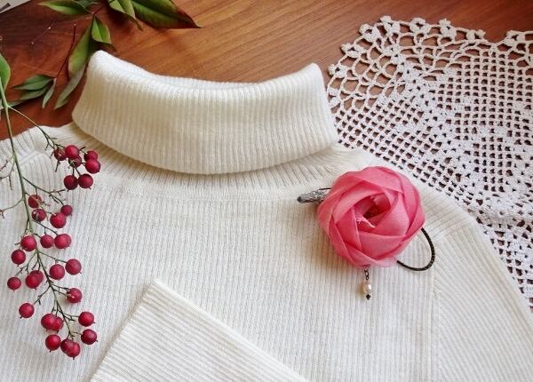 ローズピンクのシルクオーガンジーを使ったバラのコサージュ。
