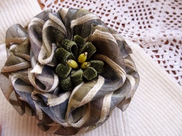 金糸を織り込んであるオーガンジーでコサージュを作りました。