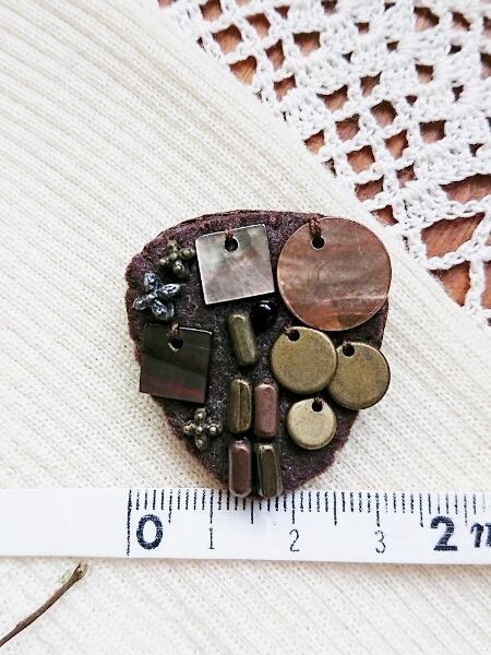 フェルトの台に貝ビーズとメタルパーツで面白い形のブローチを作りました。