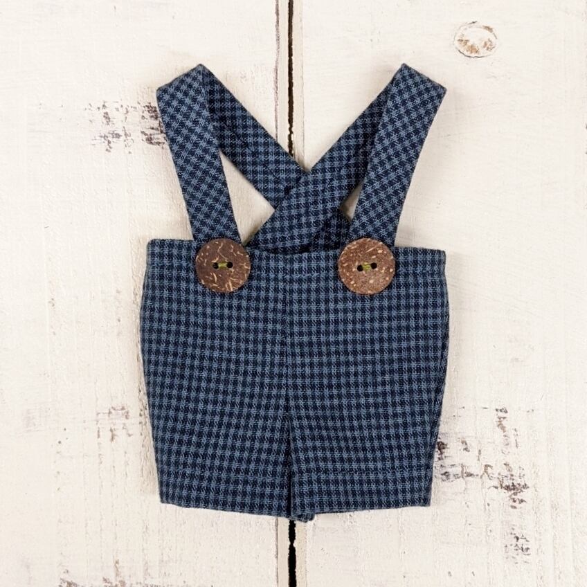 こまかいチェックの吊りズボン ボタンはココナッツです (人形はついていません。ズボンのみの販売です)