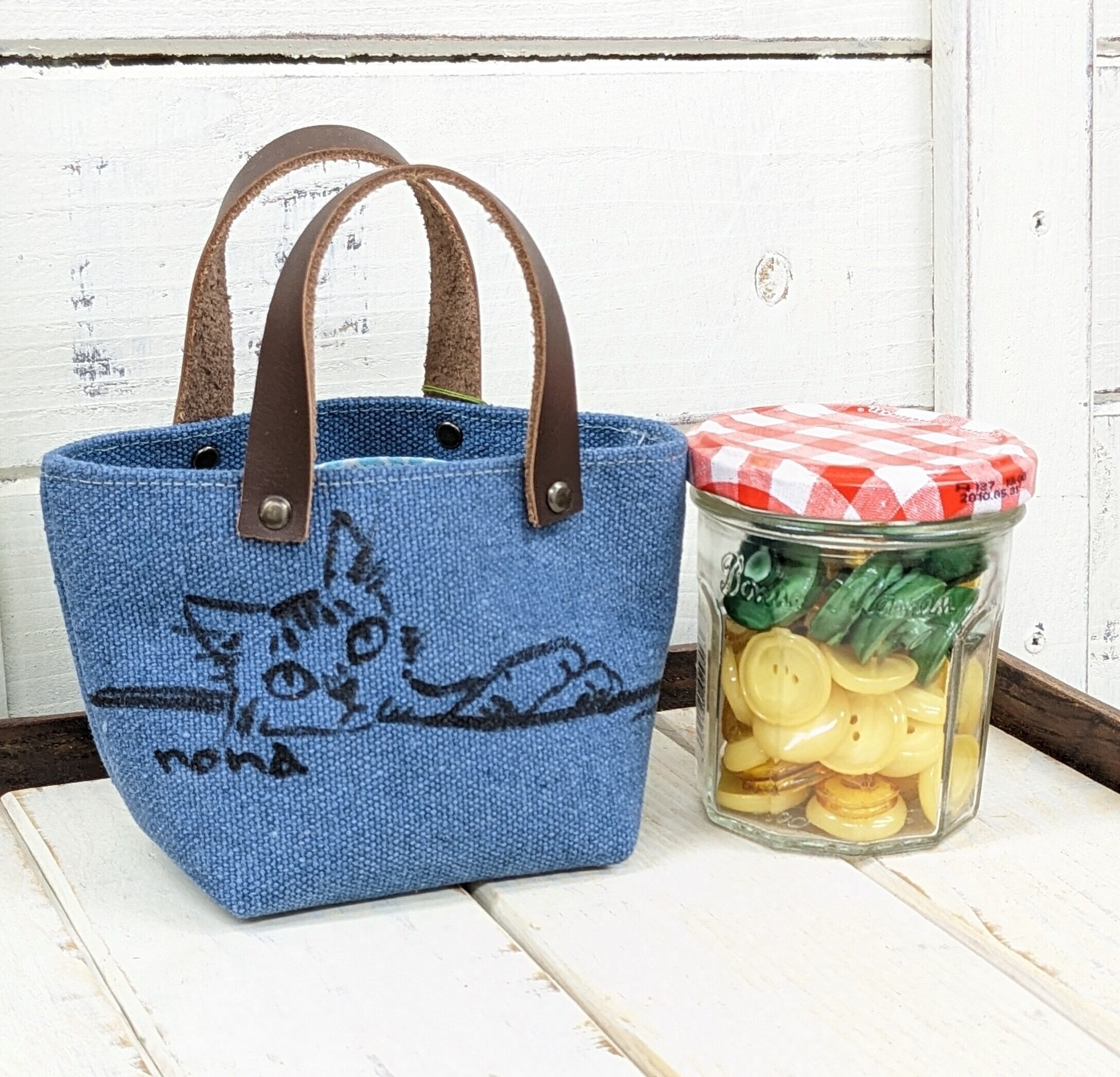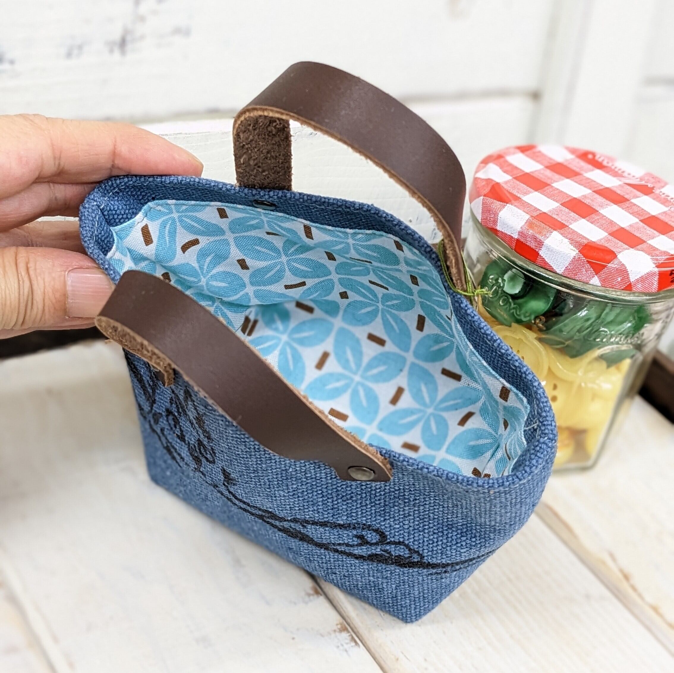 小さな小さなトートバッグです。小さいけど持ち手は本革でカシメどめ。裏地もついています。